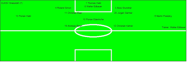 DJKSV Griesstätt: 1 Thomas Habl - 4 Roland Simon (70. 2 Bernhard Oberlinner), 8 Walter Edbauer, 3 Alois Grundner - 13 Florian Habl (55. 16 Seppi Ott), 11 Christian Eser, 10 Florian Edenhofer, 20 Jürgen Gartner, 6 Martin Polatzky (80. 15 Daniel Meier) - 19 Andreas Baierl, 12 Christian Kehrer; Trainer: Walter Edbauer FC Maitenbeth: Rupert Mayerhofer (75. Moritz Zitzewitz), Gabrial Zenz, Andreas Bauer, Andreas Göpbel (86. Pascal Löhr), Gerhard Steinweber, Andreas Kain, Roman Schwimmer (63. Klaus Kleber), Michael Anderl, Gerhard Poprawa, Tilmann Meier, Bernd Kleber Tore: 0:1 Bernd Kleber (2. / Andreas Göpbel); 1:1 Martin Polatzky (21. / Florian Habl); 1:2 Bernd Kleber (Foulelfmeter, 55.); 2:2 Seppi Ott (74. / Walter Edbauer) Schiedsrichter: Sascha Ellmann (Vagen) Zuschauer: 70 |